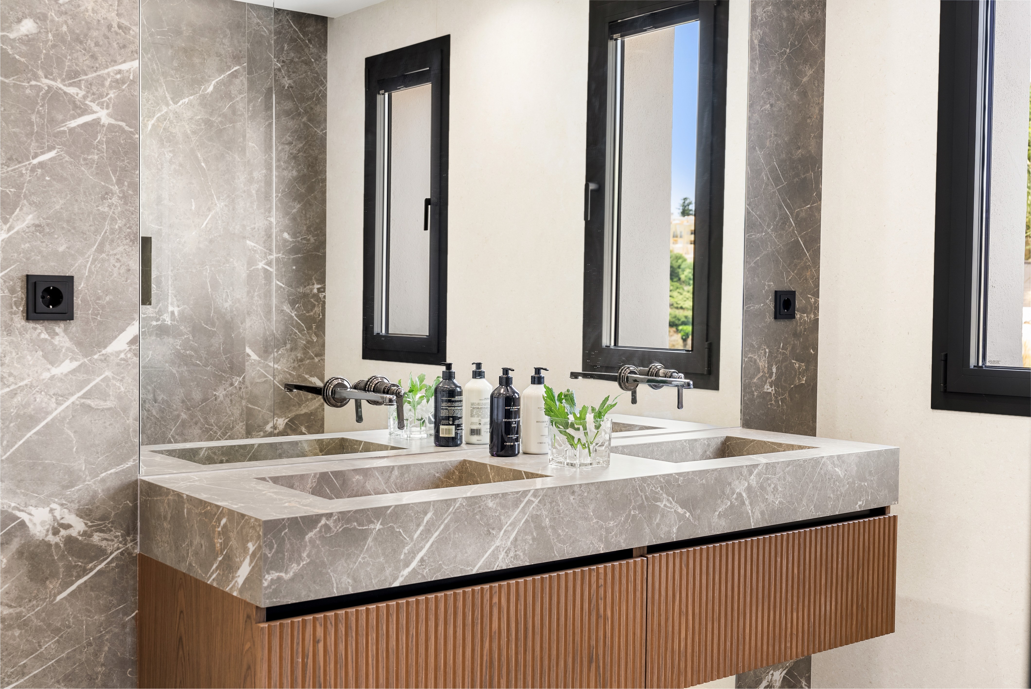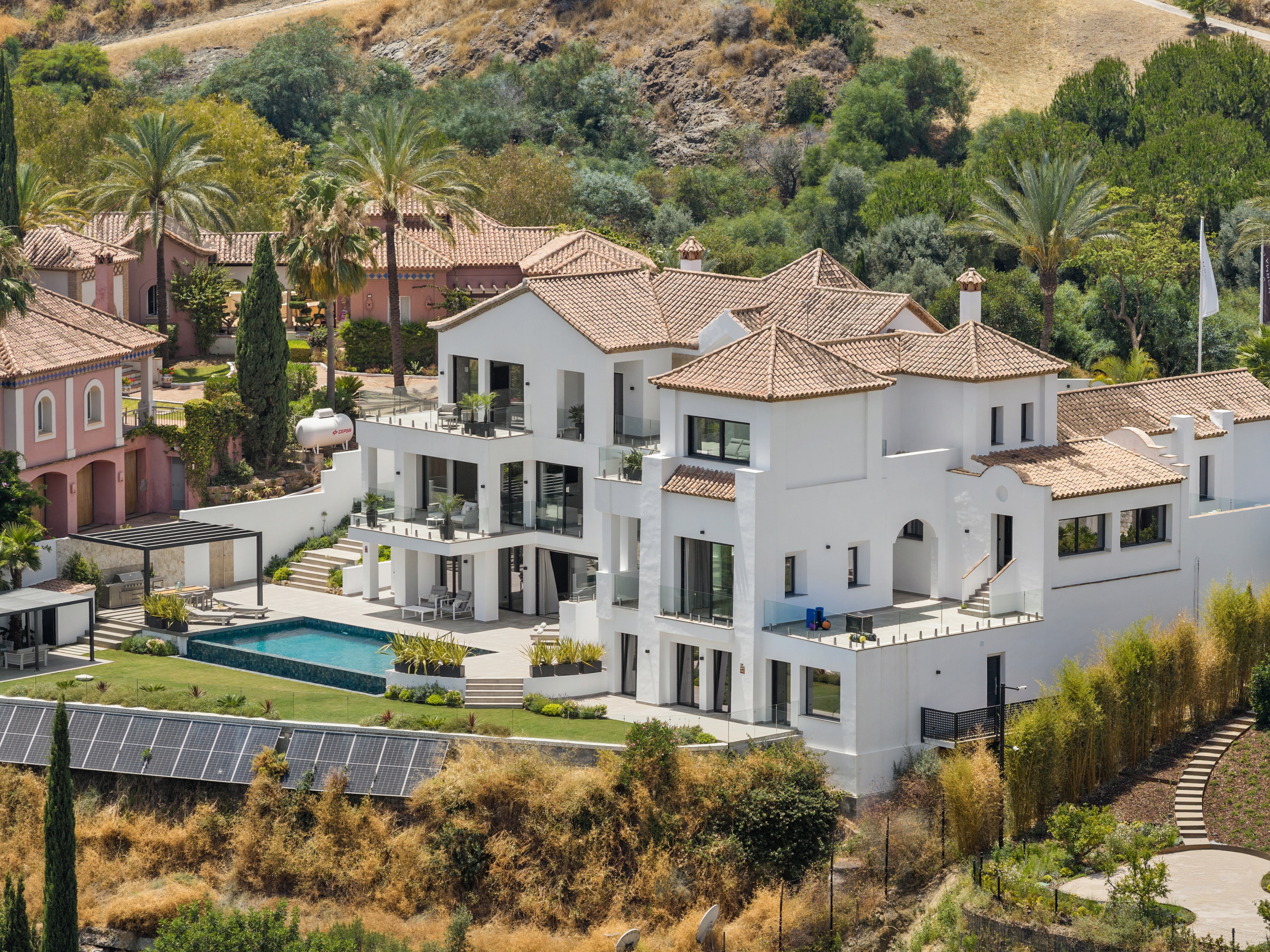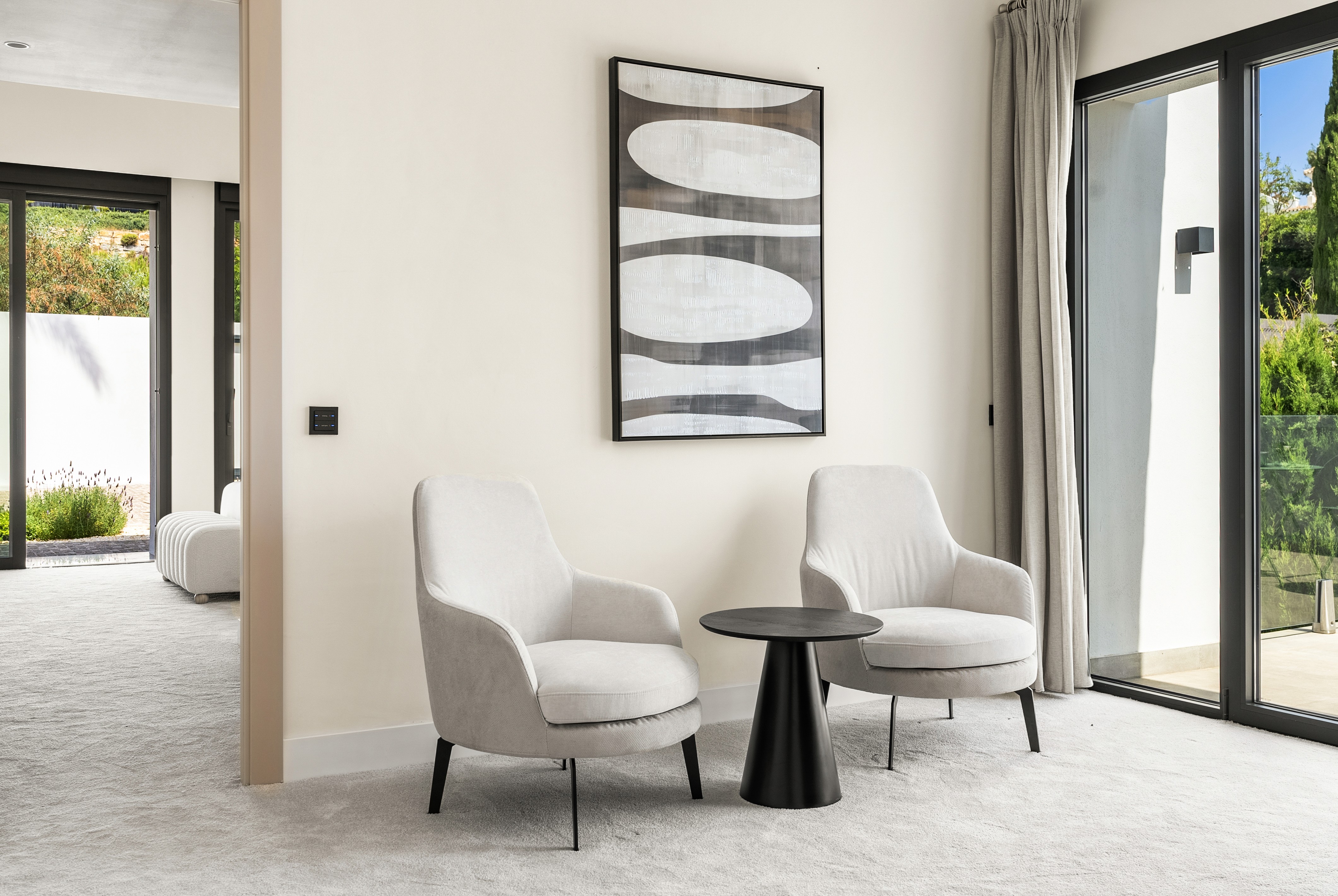 Located in Los Flamingos, with open views to the sea and the mountains, Villa Rebecka sits on a plot of over 2,000 m². Traditional tiled roofs meet modern, double-height ceilings, and floor-to-ceiling windows that flood the spaces with natural light. Spread across three levels connected by lift, the layout balances flow and comfort.