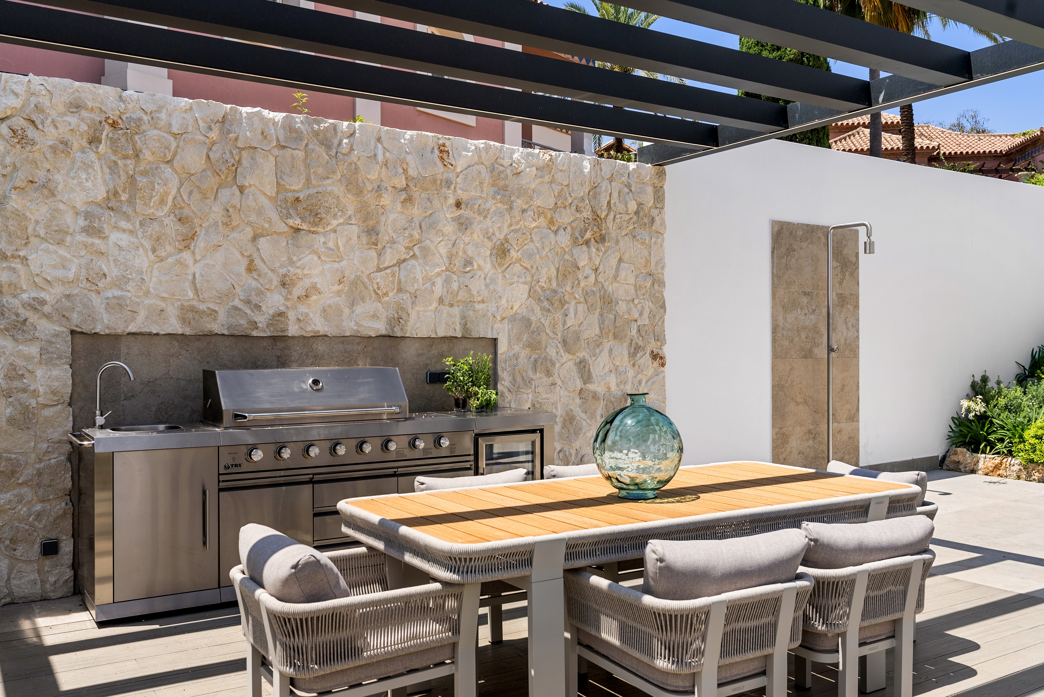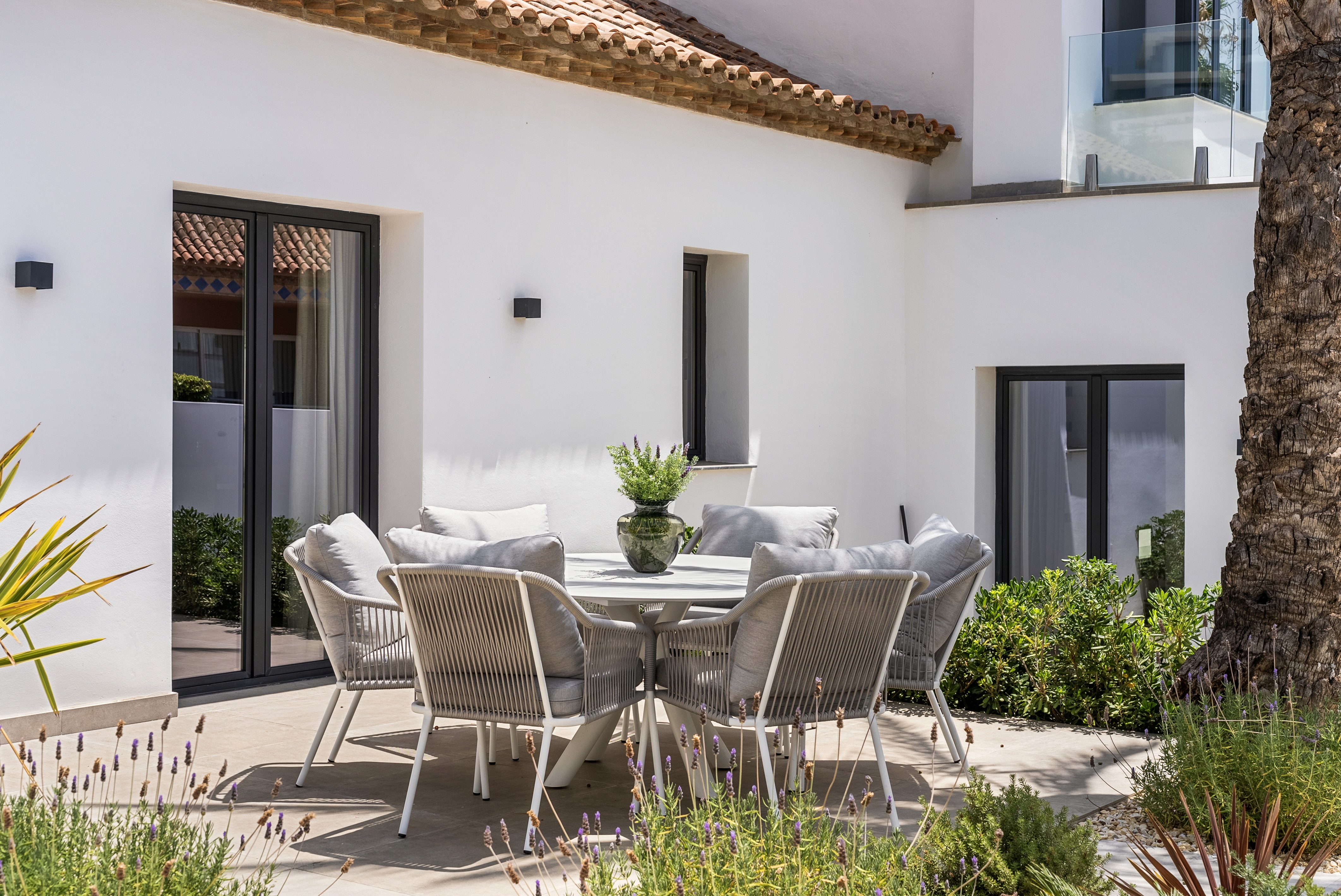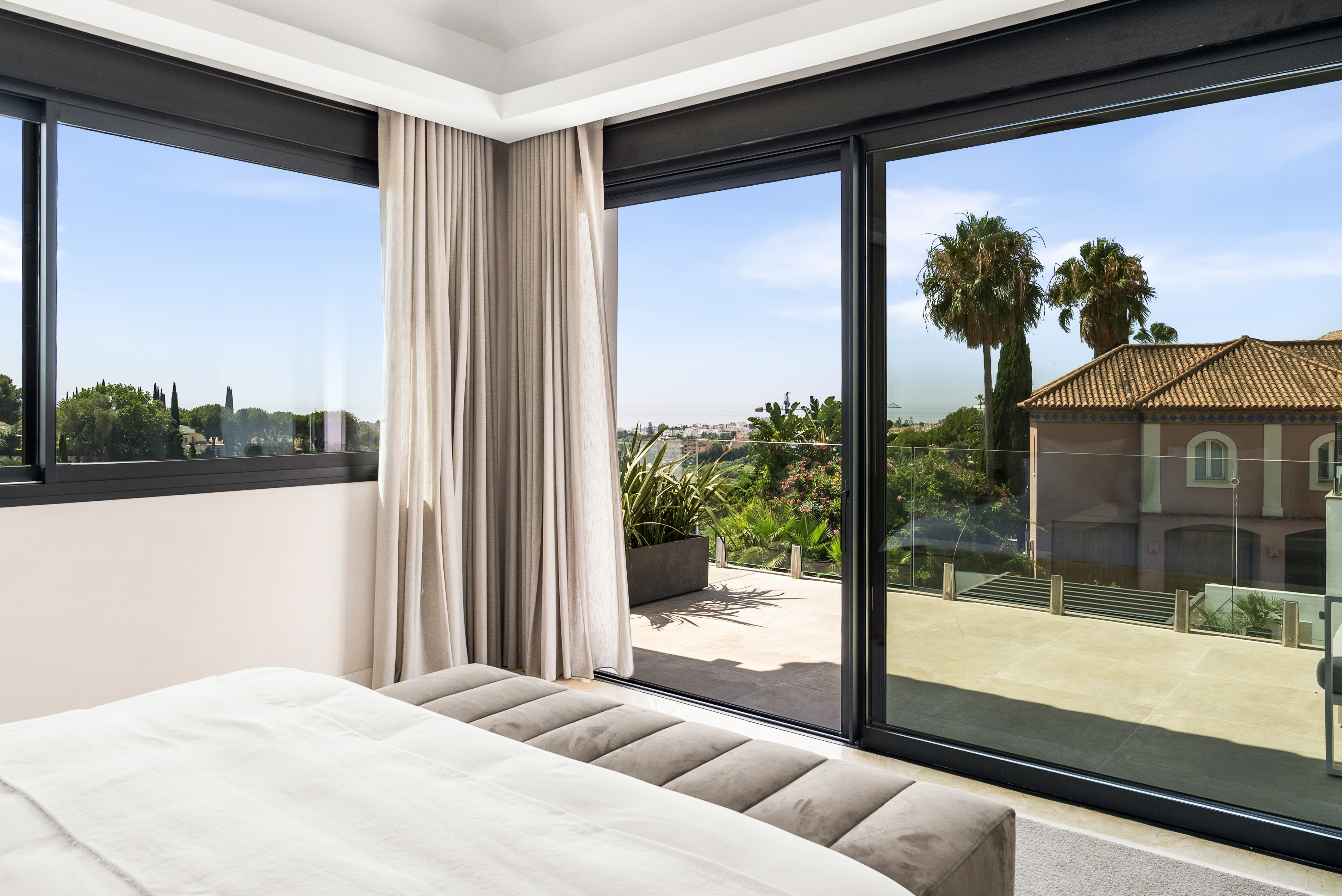 Located in Los Flamingos, with open views to the sea and the mountains, Villa Rebecka sits on a plot of over 2,000 m². Traditional tiled roofs meet modern, double-height ceilings, and floor-to-ceiling windows that flood the spaces with natural light. Spread across three levels connected by lift, the layout balances flow and comfort.