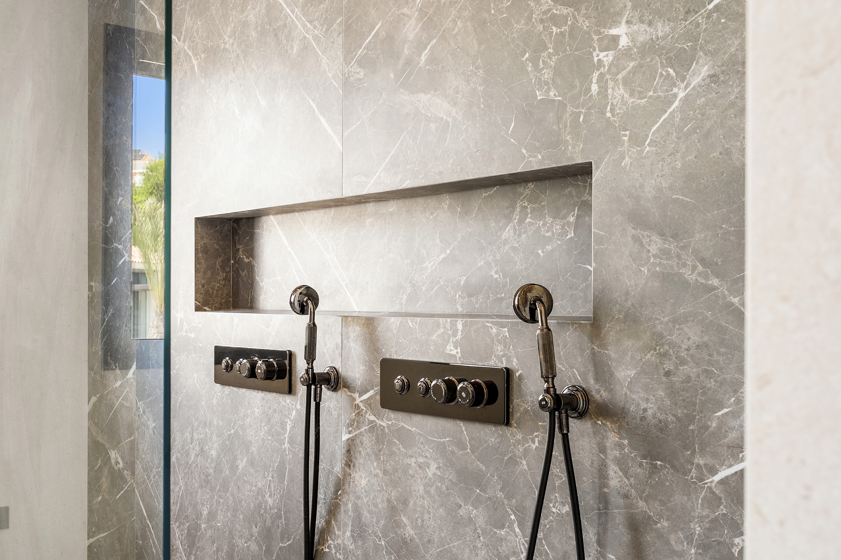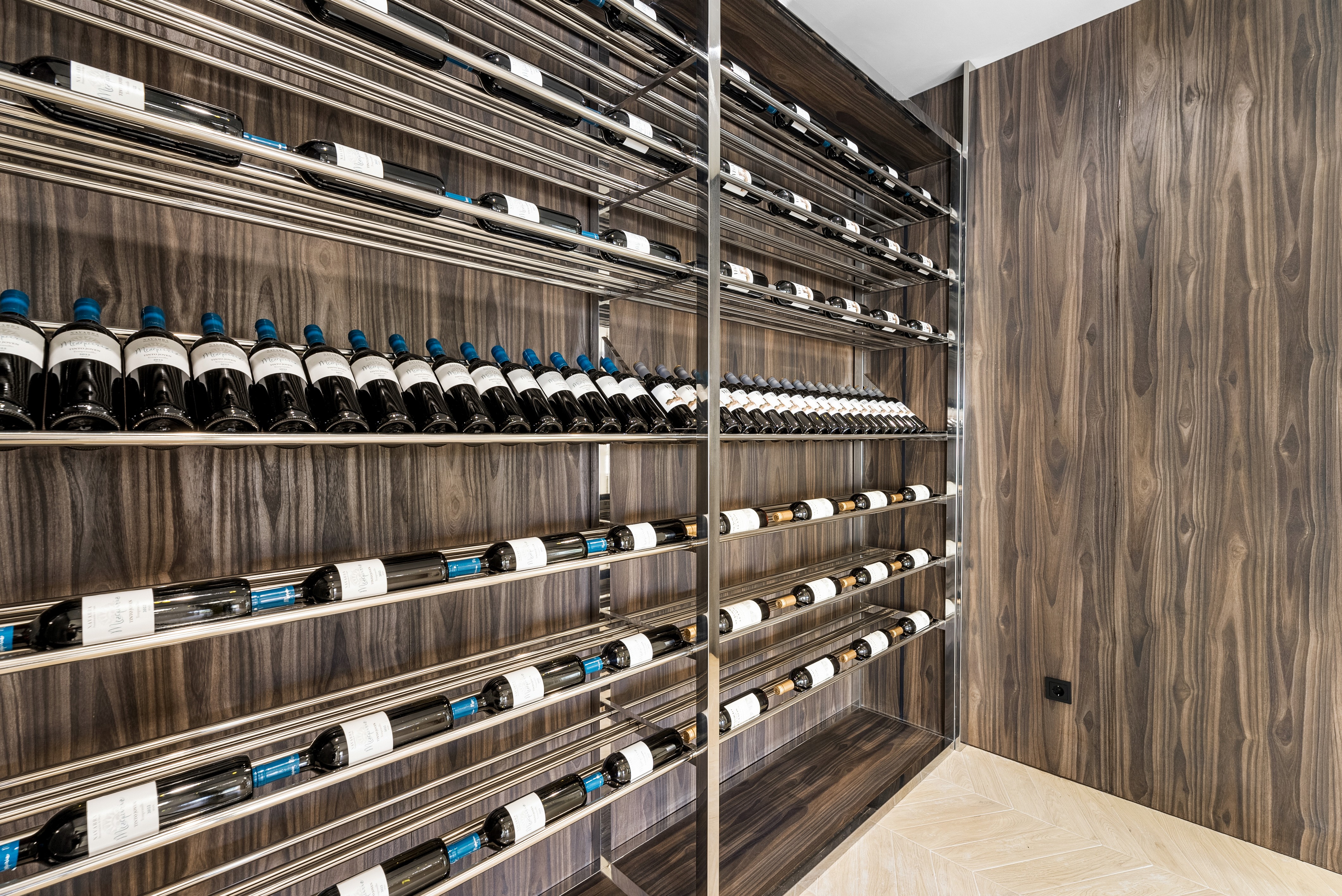 The main level connects the living and dining areas to a fully fitted Gaggenau kitchen with Italian carpentry. Six en-suite bedrooms are distributed across the house, along with a large office that can be adapted as a seventh bedroom.