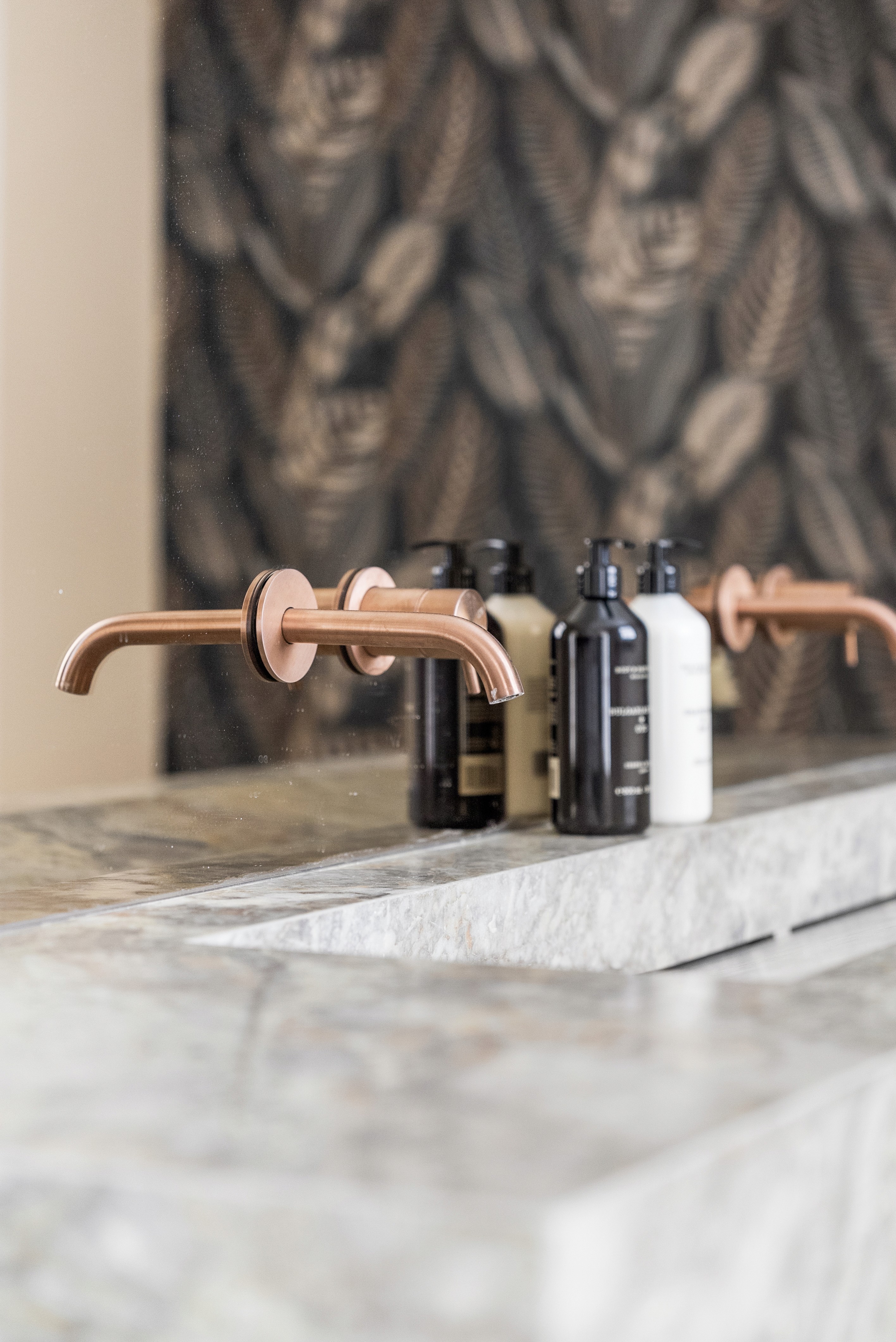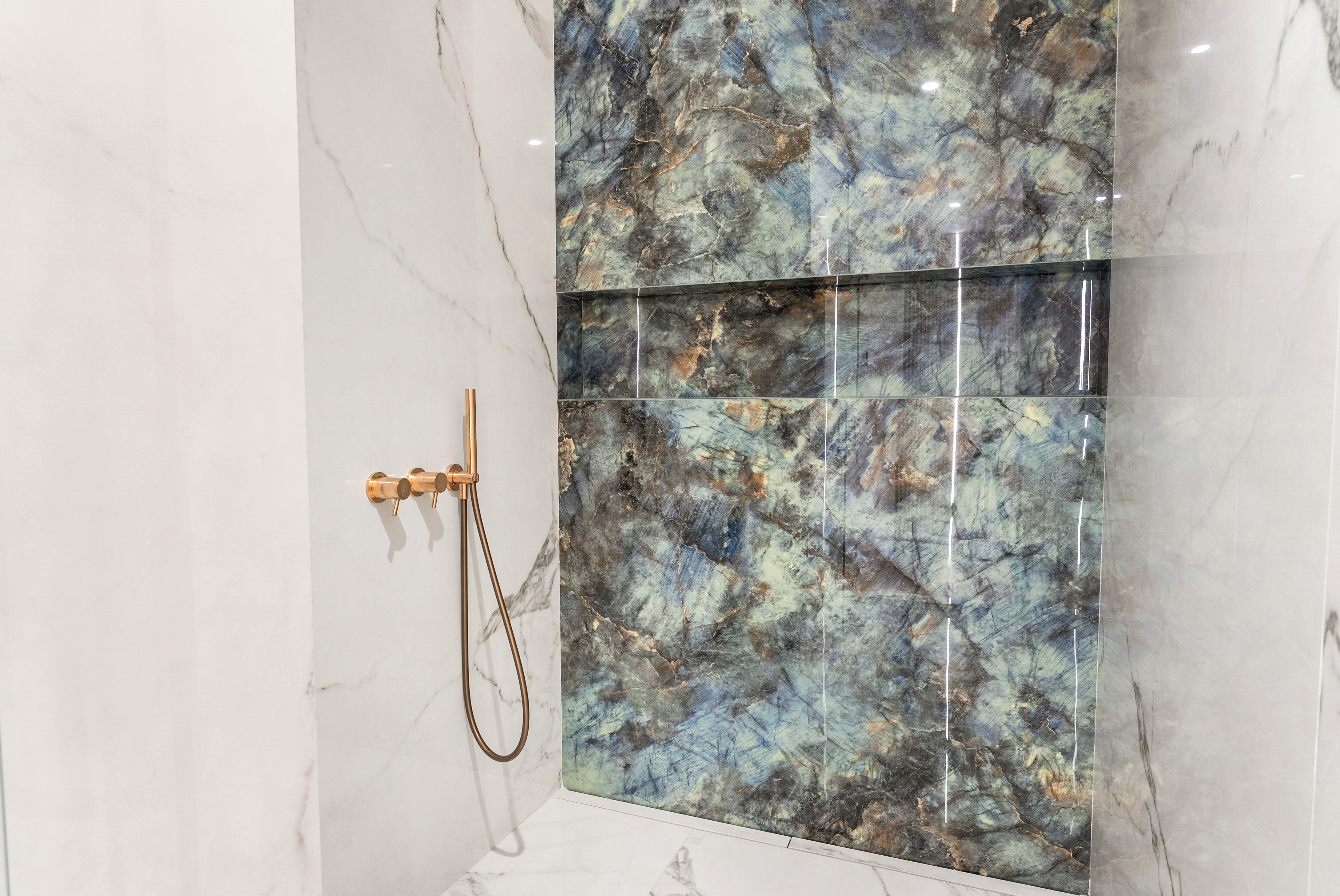 On the lower floor, a second lounge with kitchenette, a cinema room, a fully equipped gym with steam room and shower, and a laundry area extend the living spaces. Bathrooms feature Gessi taps and Italian-grade porcelain tiles. A landscaped pool frames the heated saltwater pool and the terraces designed for outdoor living. The property includes a three-car garage and additional driveway parking. Spacious, private, and designed for family living.